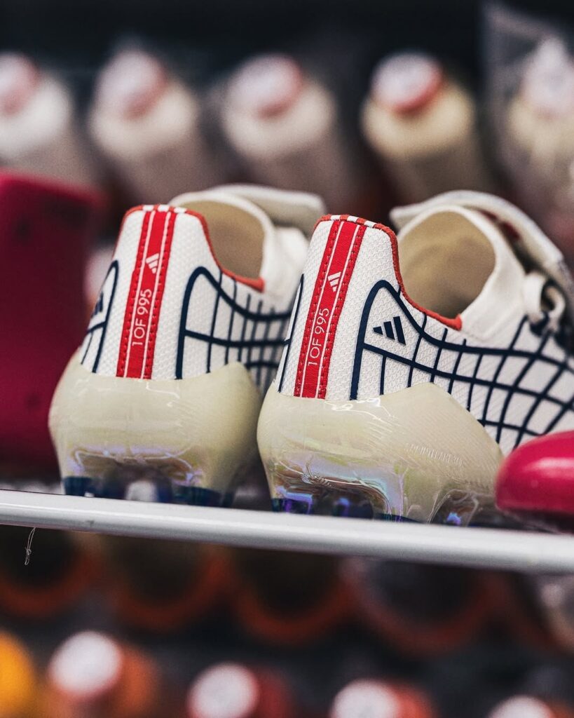 The reborn F50 Spider keeps its white base, red Three Stripes and that iconic web-graphic stretched across the upper. A fold-over tongue nods to its early-2000s roots, while gold detailing and “1995–2025” aglets mark Unisport’s milestone year. Only 995 pairs exist – part collectible, part cultural artefact.